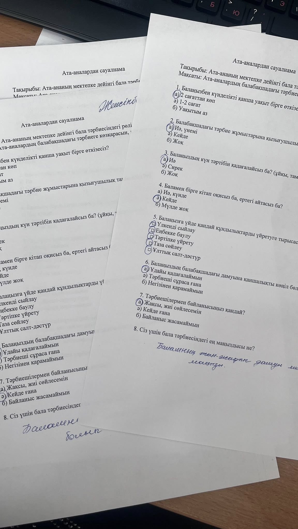 Сауалнама нәтижесі бойынша ата- аналардың басымы сұрақтарға “ оң” жауап берген. Бала тәрбиесіне үйде барлығы белсенді ат салысатыны анықталды.